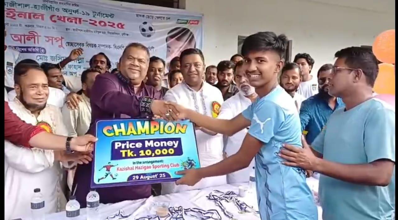 মুন্সীগঞ্জের সিরাজদিখানে কাজীশাল-হাজীগাঁও অনূর্ধ্ব-১৯ ফুটবল টুর্নামেন্টে হাজীগাঁও চ্যাম্পিয়ন হয়েছে। শুক্রবার বিকেলে কাজীশাল-হাজীগাঁও হাইস্কুল মাঠে অনুষ্ঠিত ফাইনালে তারা ৩-০ গোলর বড় ব্যবধানে