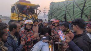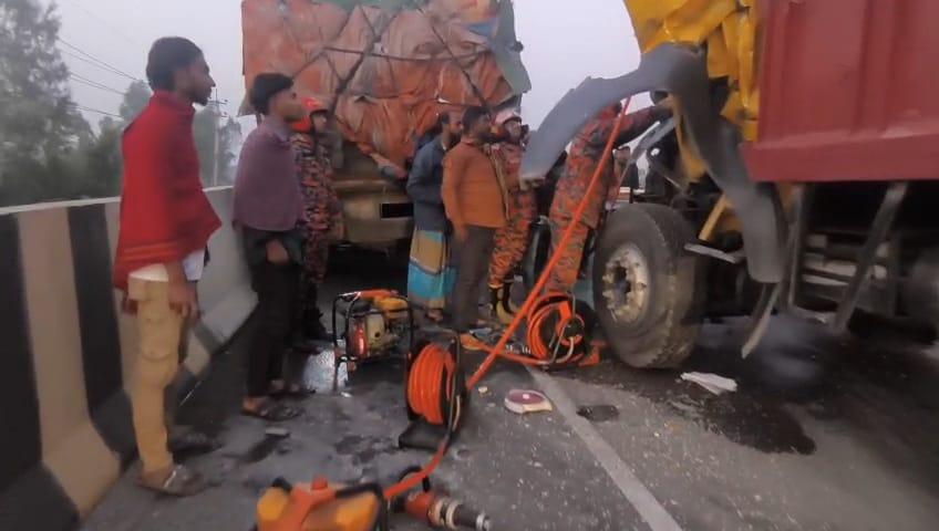 ত্রুটি মেরামতের জন্য একটি ট্রাক এক্সপ্রেসওয়েতে থেমে ছিল। এ সময় একই দিকে আসা অপর একটি ট্রাক নিয়ন্ত্রণ হারিয়ে পিছন থেকে ধাক্কা দেয়। এতে সামনের ট্রাকের হেলপার আহত হন এবং পিছনের ট্রাকের হেলপার গাড়ির ভেতরে আটকে পড়েন।